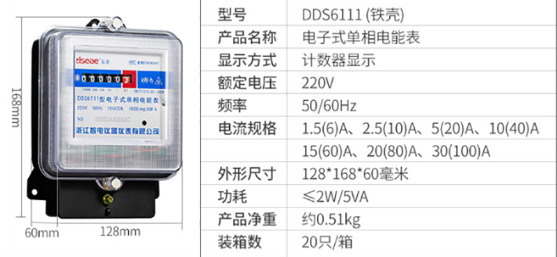 DDS6111型單相電子式電能表,由于采用集成電路和SMT制造工藝,使之測量準(zhǔn)確度,穩(wěn)定性等均得到了可靠保證.適用計(jì)量額定頻率為50Hz,額定電壓為220V的單相交流有功電能.
