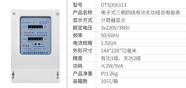 DTS(X)6111、DSS(X)6111型三相電子式有功無功組合電能表(以下簡稱電能表),是為了適應電網(wǎng)改造設(shè)計開發(fā)的有功、無功組合式電能表。它具有較高的準確度和可行性。本產(chǎn)品制造標準符合GB/T17215.321-2008《1級和2級靜止式交流有功電能表》、GB/T17215.323-2008、DL/T614-1997《多功能電能表》、DL/T645-1997《多功能電能表通信規(guī)約》等電力行業(yè)標準對三相靜止式電能表全部技術(shù)要求,是對需要進行無功電量考核的企業(yè)、變電站或電廠理想的選擇,亦適合輸配電或配網(wǎng)自動化用表。本產(chǎn)品可供計量參比頻率為50Hz電網(wǎng)中的三相交流有功和無功電能,并能進行正、反向電能計量和紅外及RS485通訊功能。其特點是精度高、可靠性好、寬負荷、低功耗、誤差曲線平直、抗干擾能力強。